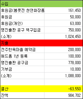 2010년 6월 후원금 사용 페이지 정보 작성자 juliee 쪽지보내기 메일보내기 자기소개 아이디로 검색 전체게시물 쪽지보내기 메일보내기 자기소개 아이디로 검색 전체게시물 작성일10-11-17 23:28 조회943회 댓글0건 이전글 다음글 목록 답변 글쓰기 본문 명진출판 책 공구를 했는데,신청은 75명을 받았고 오버금액은 몇분께 제가 선물로 책을 드리게 되어서 오버금액이 나왔네요.감사합니다!! 댓글목록 등록된 댓글이 없습니다. 이전글 다음글 목록 답변 글쓰기
