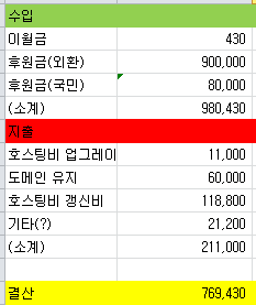 (지출)의 기타(?)는... 제가 대충 계산해서 도메인업체 예치금으로 입금했더니 도메인업체의 예치금으로 묶여 버렸네요.