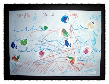 자연관찰 바다생물 펴놓고 바다 그리고 스티커 붙이면서 노는 사진이예요.