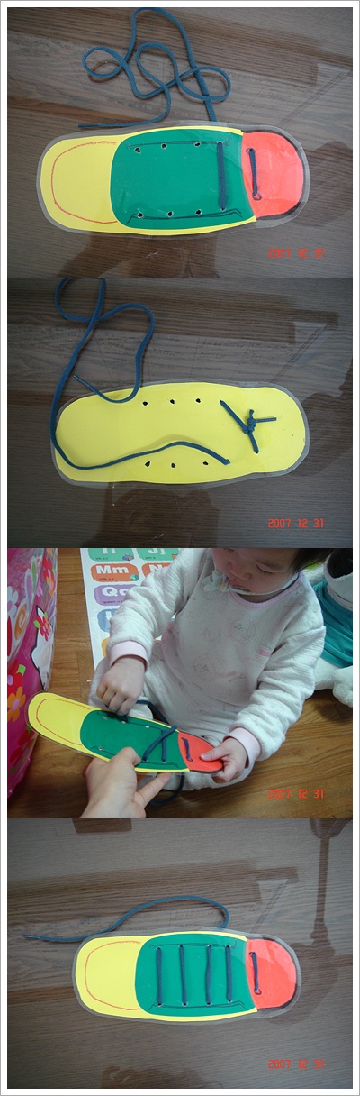 저처럼 색지에 운동화 그리시던지, 운동화 그림 하나 프린트하셔셔 코팅하시고(전 손코팅) 펀치나 송곳으로 구멍 뚫으시면 되구요, 운동화끈을 한곳만 고정시키세요.
