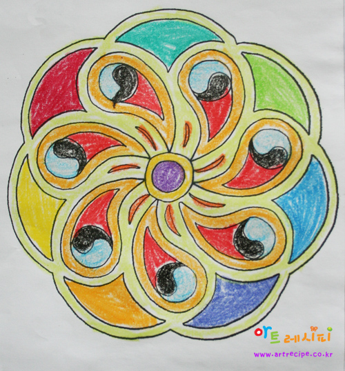 - 이 만다라 그림을 그리는 동안 마음의 안정을 취할 수 있으며 자기 안에 있는 에너지를 모을 수 있고 자연스럽게 정신을 집중 시킬 수 있다는 점에서 시중에 나와 있는 색칠 공부와는 다르게 임신부나 아이들에게 아주 좋은 미술 활동이 된답니다. ^^